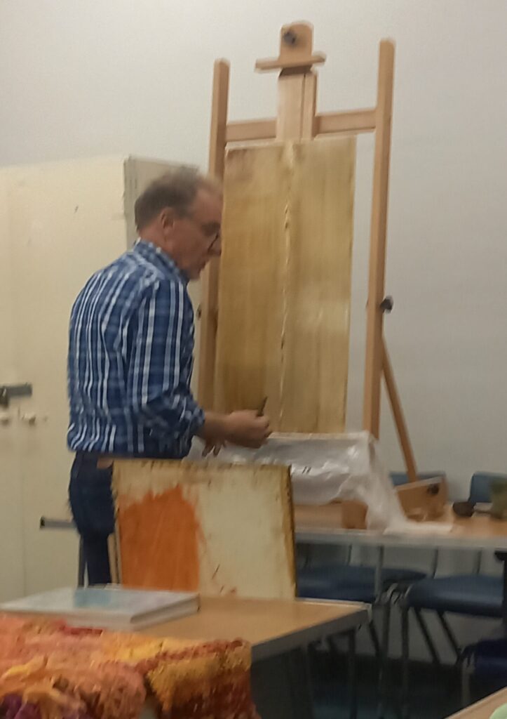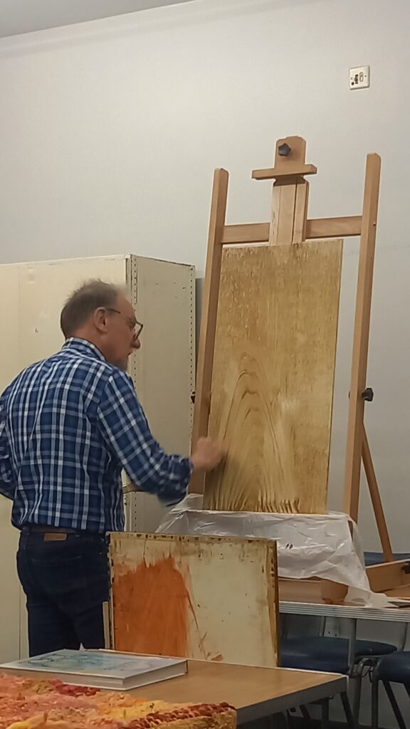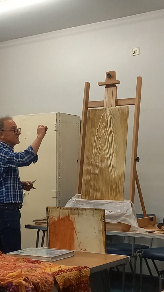 He then showed examples of hand-painted ‘marble’ panels and proceeded to give a fascinating demo, creating a variety of wood grains on a panel using oil paint and a number of simple tools… the knowledge and expertise Steve has is superb.