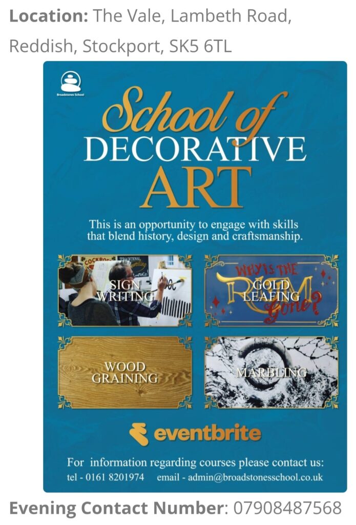 Broadstones School is running post 16 adult courses, and the ones Steve runs are in Decorative Art. Details can be found on their website.