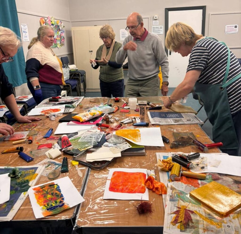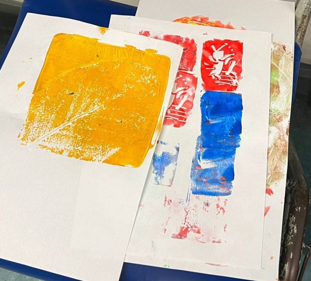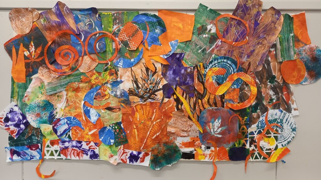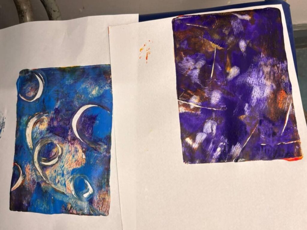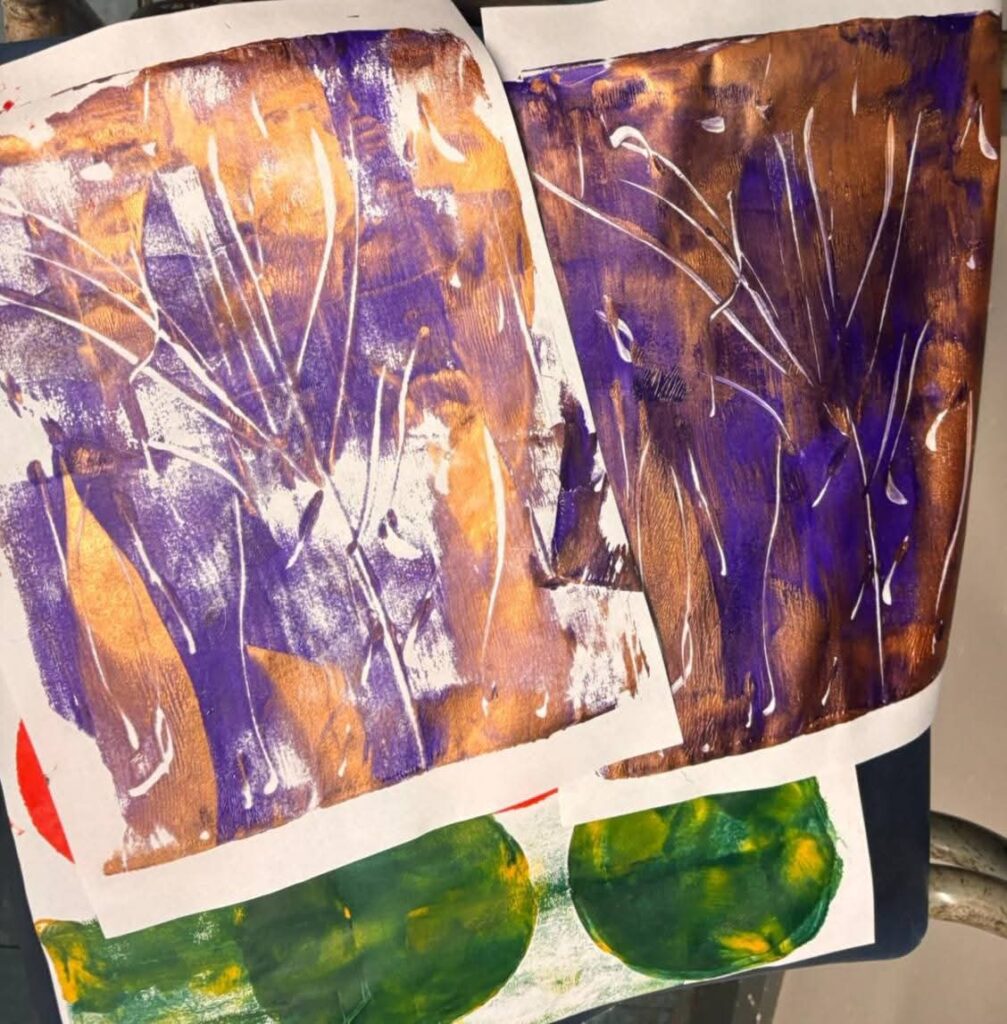 If you weren’t there for this, you missed a great group art session on the theme of ‘Fireworks and everything that goes Bang’. Following on from the printing demonstration by Vaibhavi recently, everyone tried gelli printing with a variety of sizes and shapes of gelli plates using acrylic paint and lots of stencils, tools and leaves. We also experimented with Brusho which gave super, vibrant, firework-y effects! The results were then built into a huge, colourful collage, thanks to everyone for a great evening.