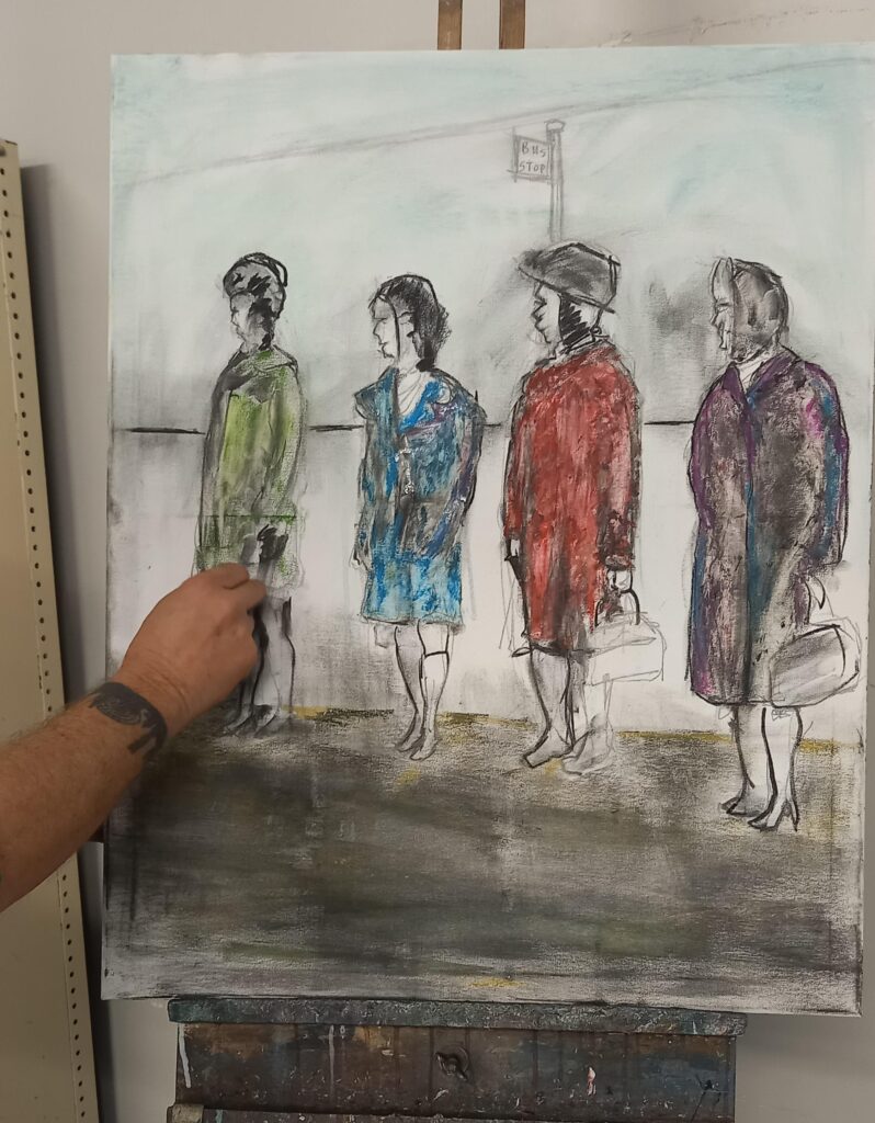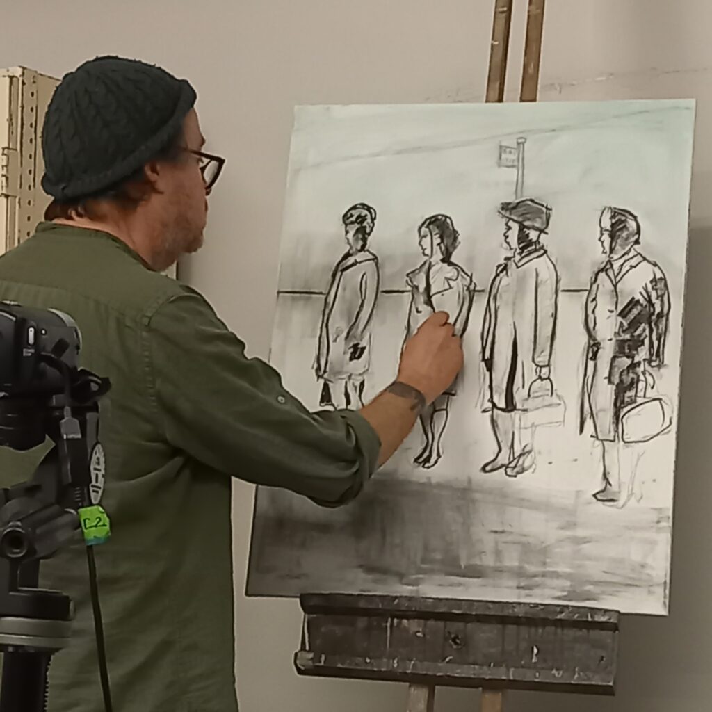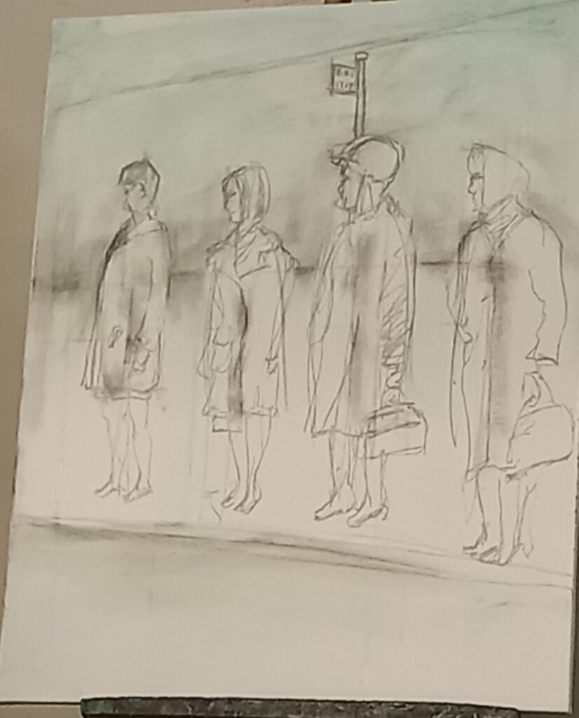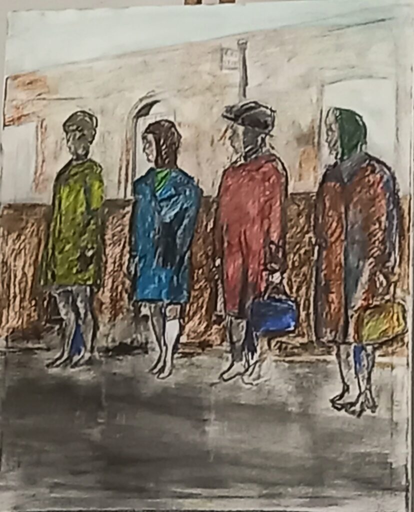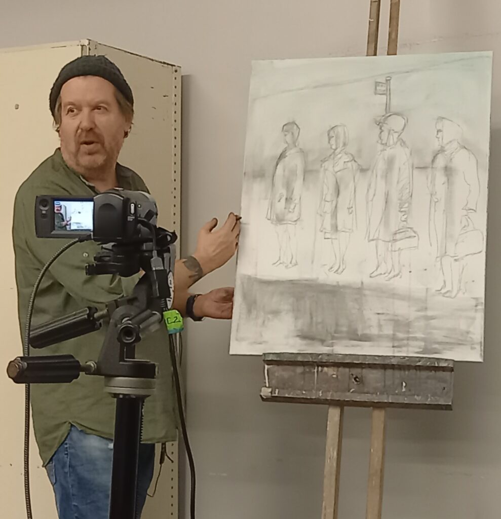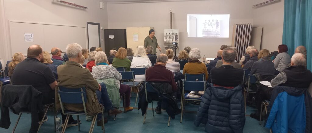 A fascinating demonstration last night by expressionist artist Mike Waldron. He loves painting Manchester stories, and didn’t disappoint our great audience with an oil pastel painting based on a 1960’s black and white photo. If you’d like to see more of his work, Mike has an exhibition at The Old Parsonage, Didsbury 2nd to 29th March, and he will be there in person on Sundays (flyer in the photos)