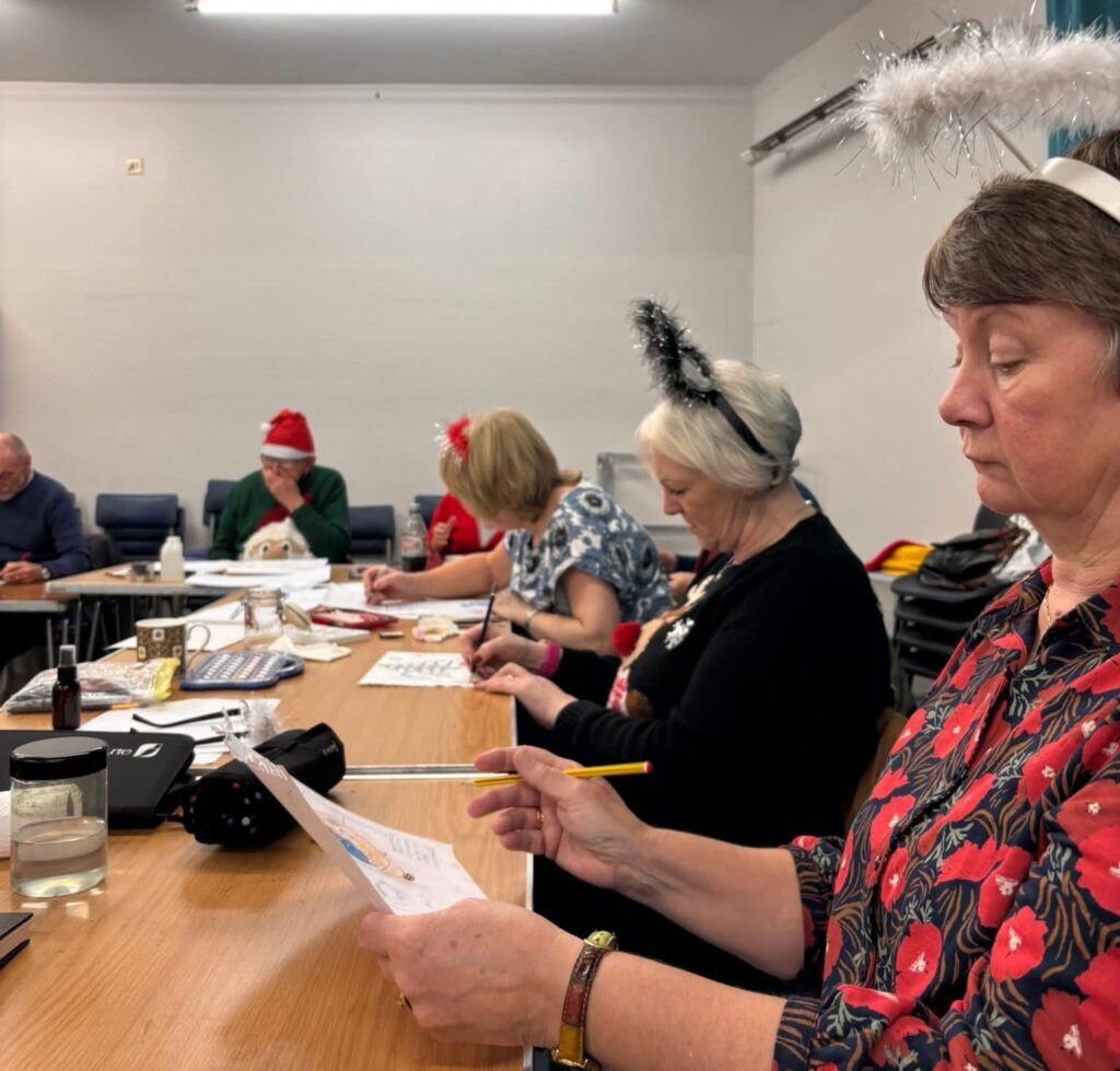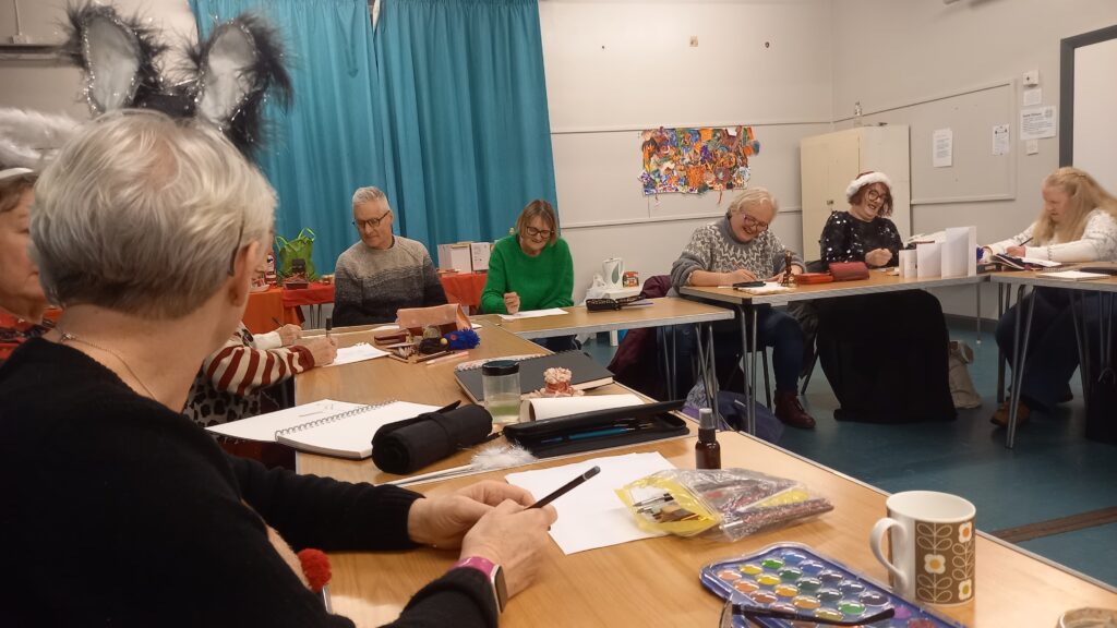 What a great evening at our Christmas Party – a good time was had by all! There were arty games, including ‘draw something related to Christmas and pass the paper on…’ and ‘draw a robin blind, but under instruction…’ – here are some of the outcomes! 😂