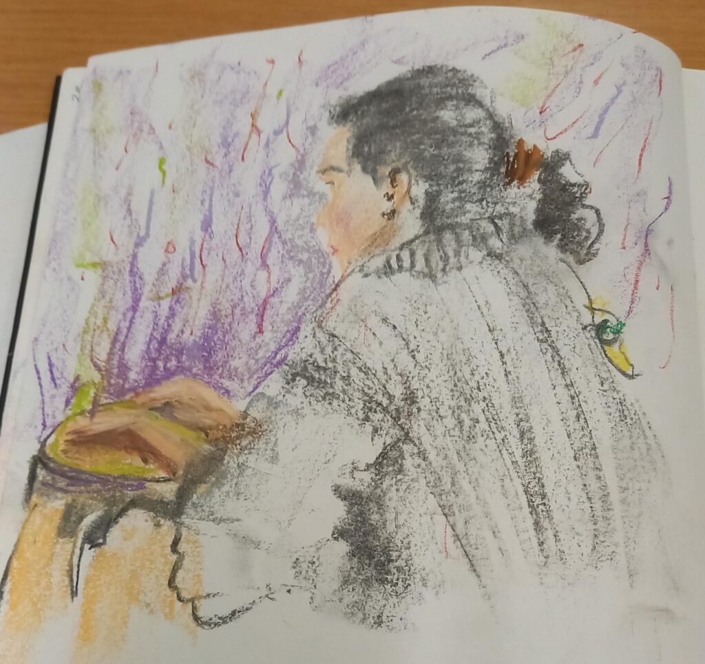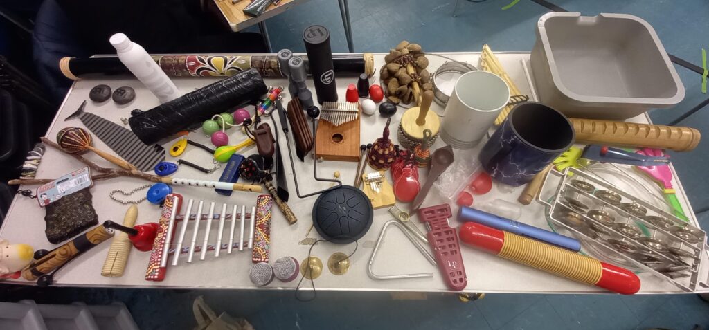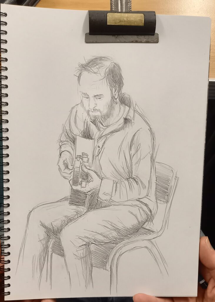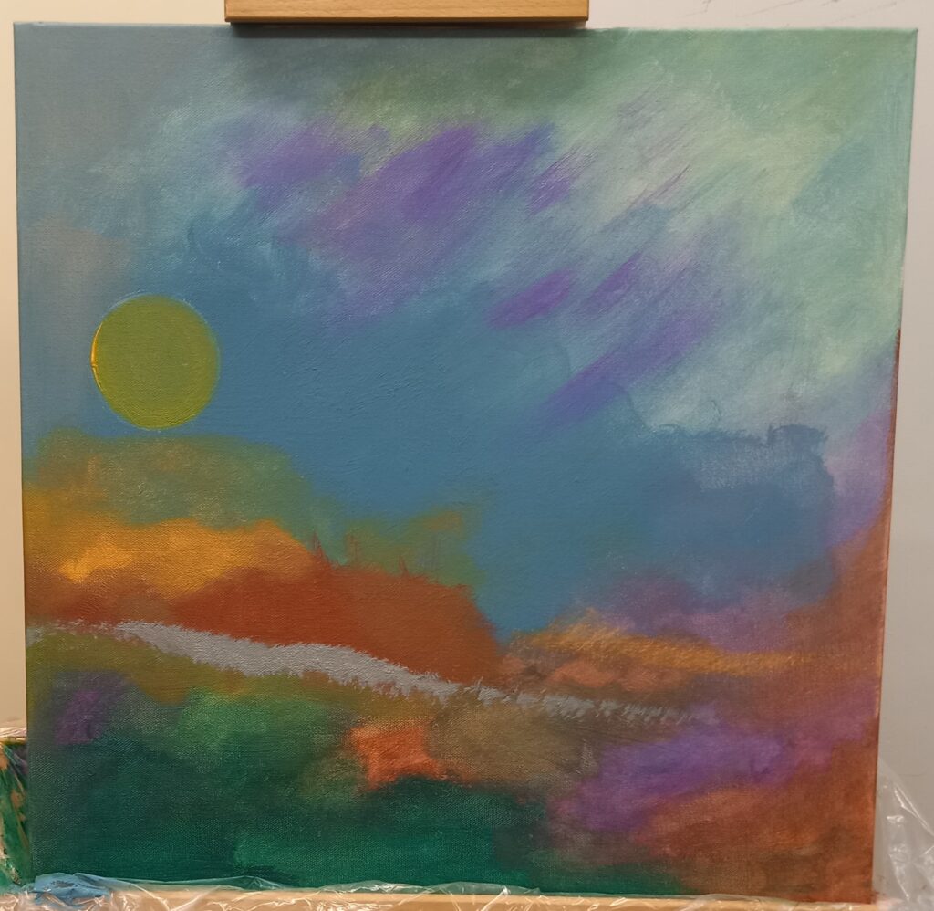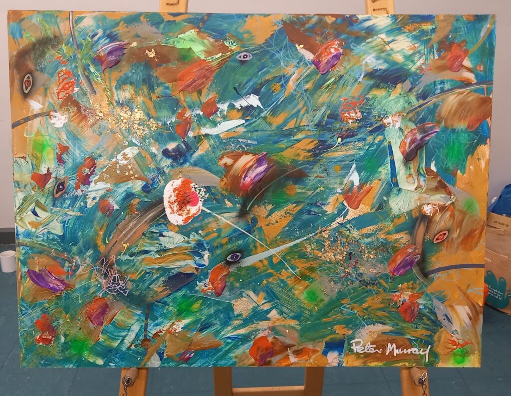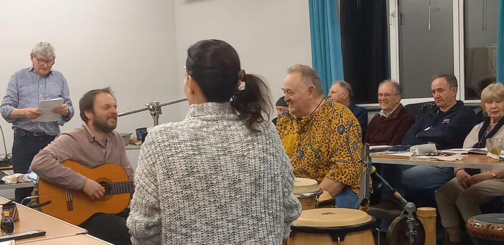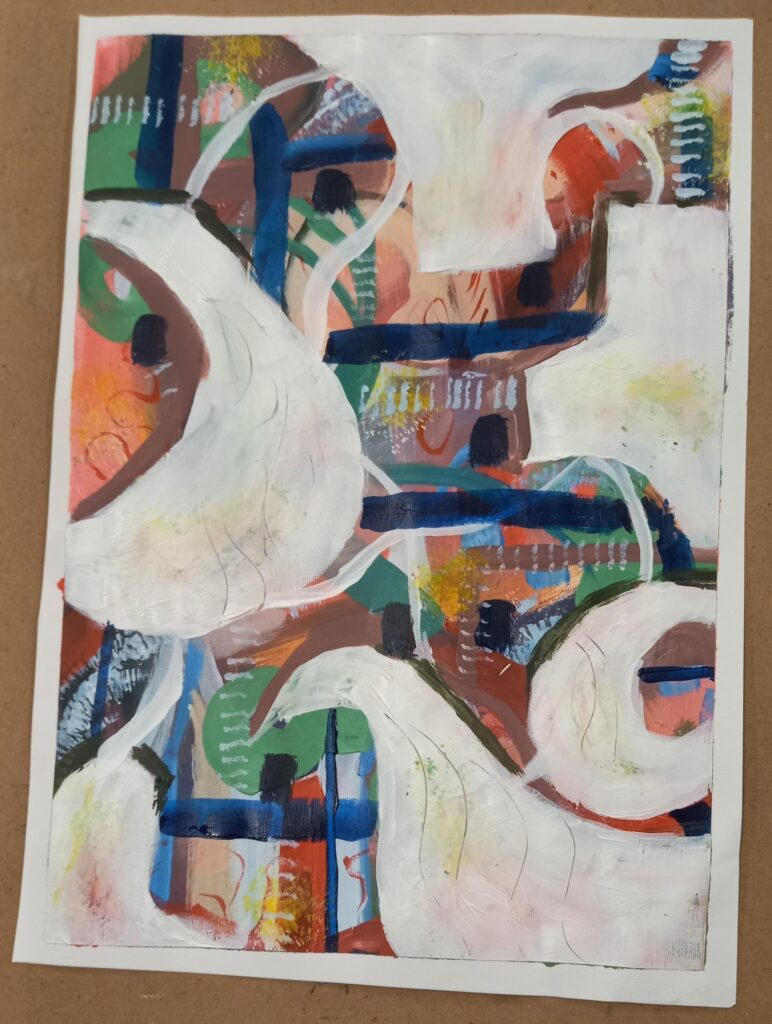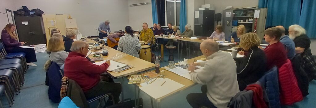 Then the music began: three skilled local musicians playing percussion and guitar live, allowing all the artists to express themselves and paint their response to the sounds, across two musical sets 🥁🎸🎨 The musicians then played their interpretation of one of Peter’s large abstracts, followed by showing our evening’s work to each other and the band, who attempted to translate some of the images into music.