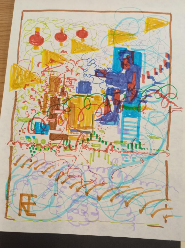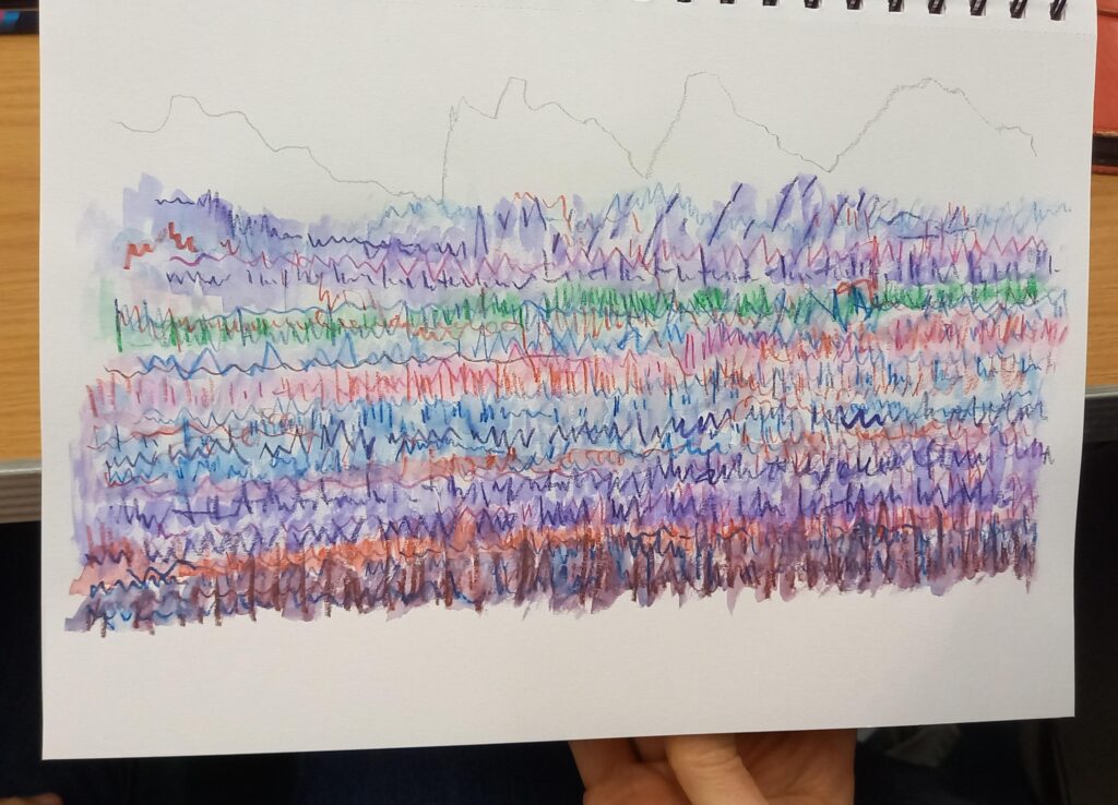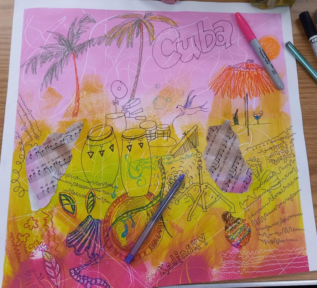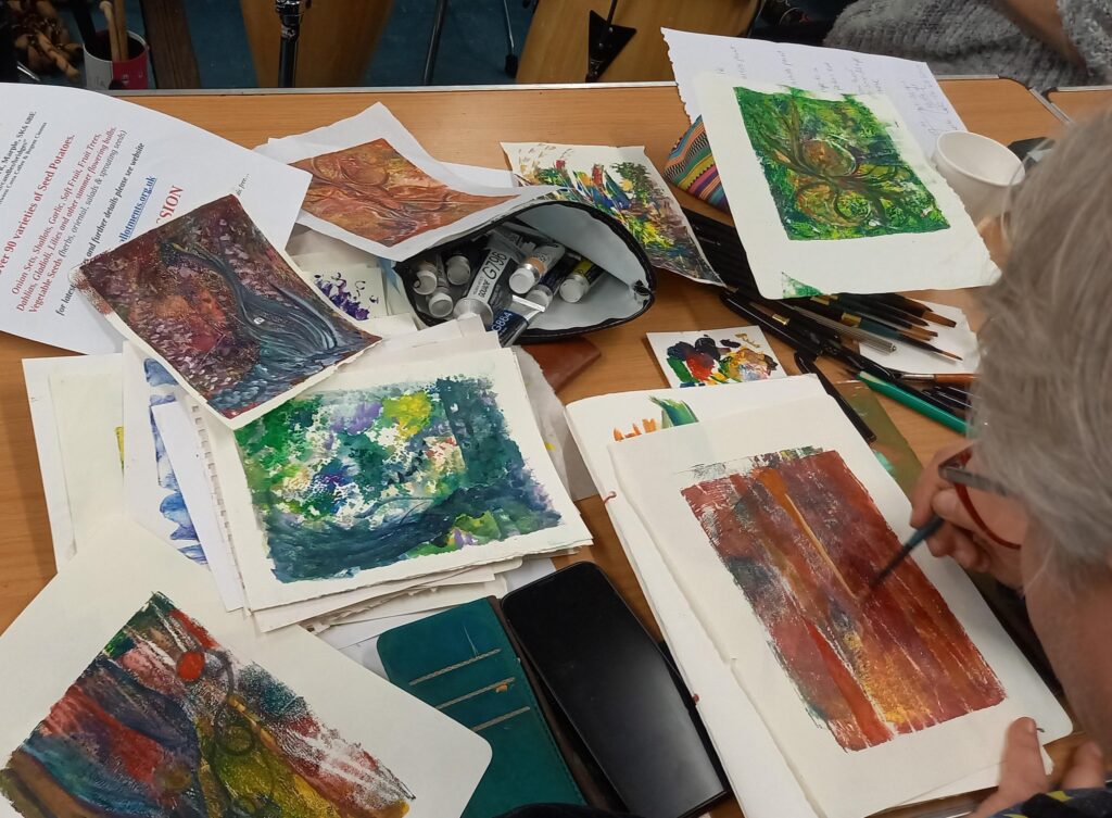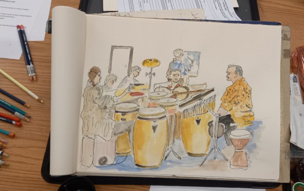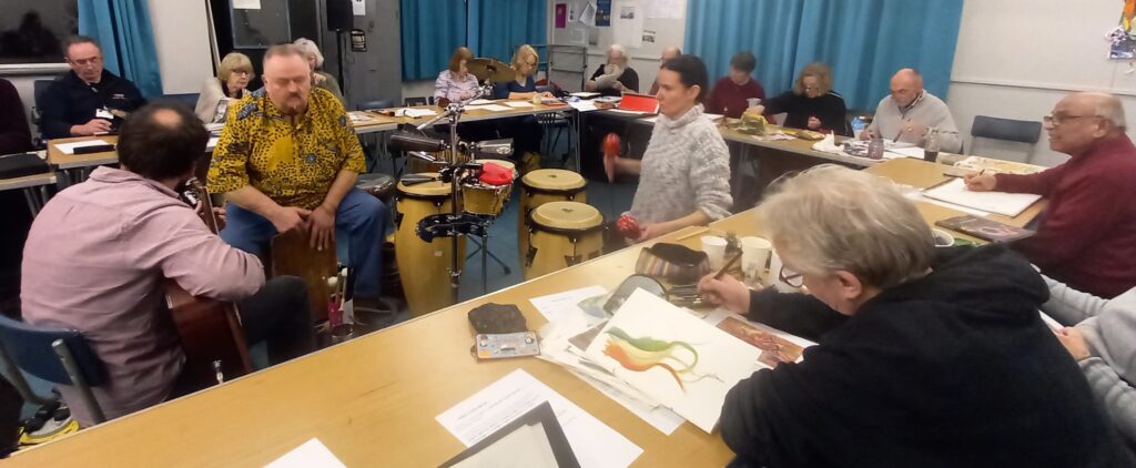 We had a full house for our ‘Brush with Music’ session, which started with a short talk on Kandinsky and the relationship between him being able to ‘see’ music, creating shapes and colours – a condition known as Synesthesia.