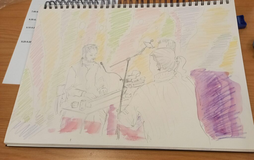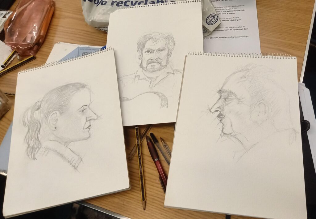 The musicians were Iain Mellor’s Drum Machine (Iain Mellor and Kate Stringfellow) with Mike Mellor on guitar and keyboard. Iain and Kate accompany harmonica maestro Robin Sunflower at his Quack Open Mic nights on Mondays 8.30pm at the White House pub in Stalybridge and Tuesdays 8.30pm at Aggie’s Bar, Marple. Every last Sunday of the month, the Drum Machine accompanies Robin Sunflower and the ace pianist Robin Dewhurst at the Strines Nightingale from 3-6pm. Every last Wednesday of the month (except December) Iain and Kate play in the Robin Sunflower Band at Big Hands in Manchester from 10.30pm until 2am. Mike Mellor hosts Open Mic nights at the Gilley in Mossley on Sunday evenings.