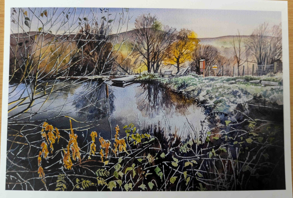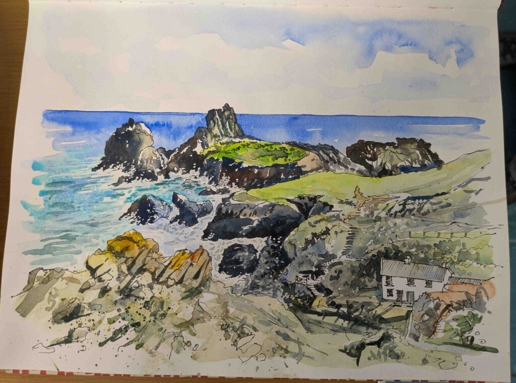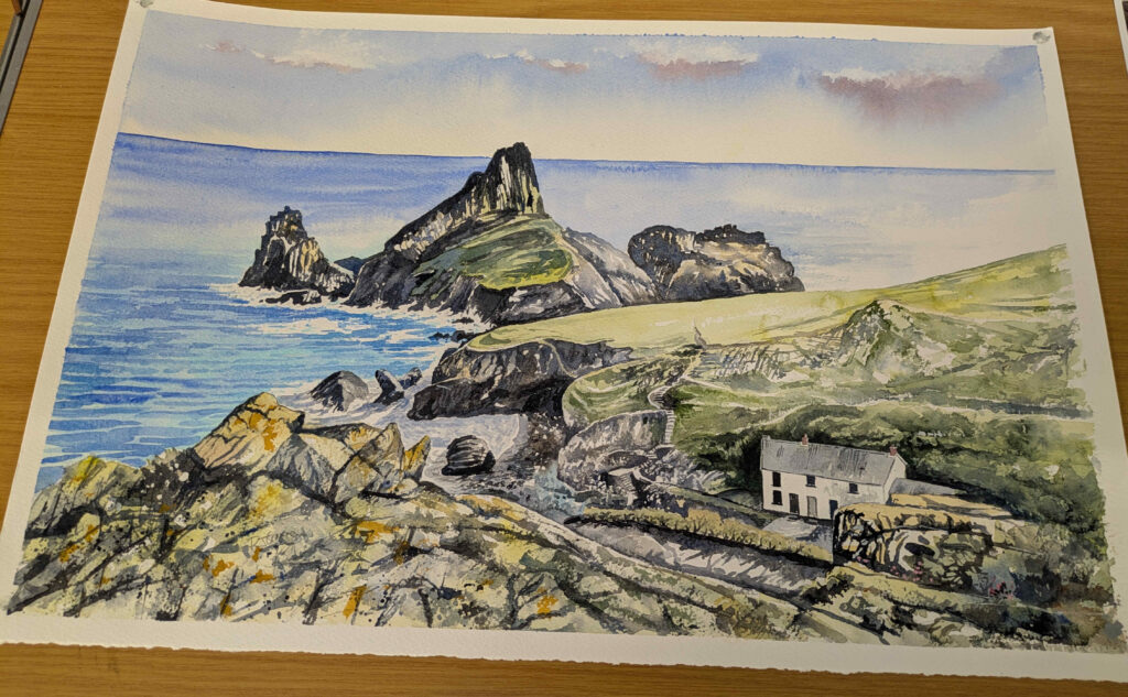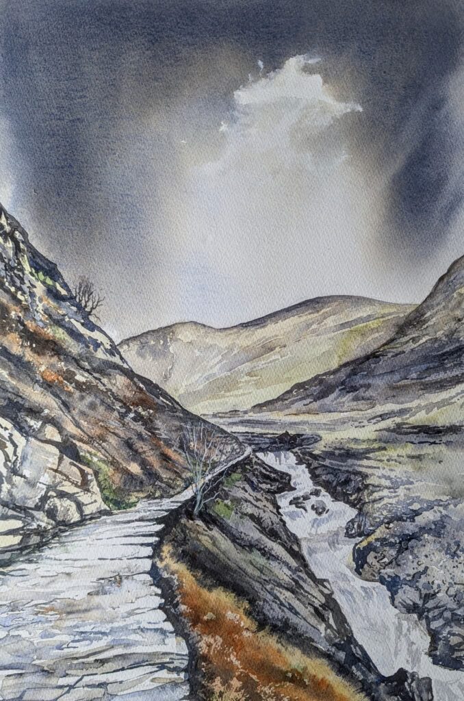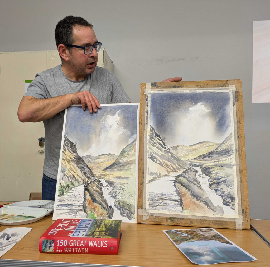 Phil Craven gave us a fascinating demo of creating a watercolour landscape – this one of a stretch of the Watkin Path on Snowdon. Some points to think about – his palette (in an old school dinner plate!) only had a few colours – French ultramarine, burnt sienna, Hooper’s green – and all the colours on the paper were mixed from them. His initial drawing was in HB pencil so as to be soft but not too dirty. For the sky, he wetted the paper before adding paint – but not for the other areas.