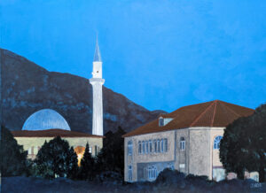 Paintings commissioned by friends – a photo of Whitehaven Harbour on an A1 canvas, a combo of photos of chalk quarries on Box Hill also on A1 canvas, and at A3, a photo of Iceland’s Red Waterfall, and the Big Mosque, Kukes, Albania.