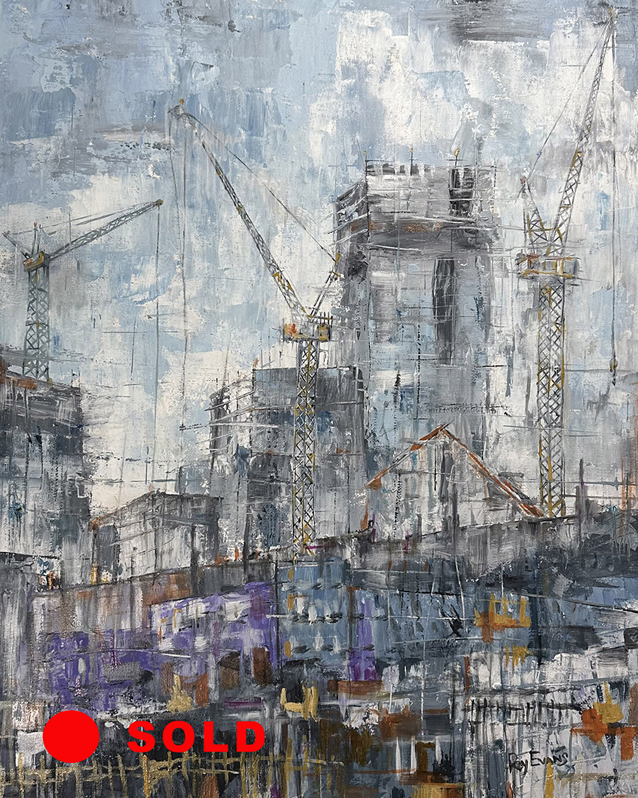 An oil painting based on sketches done in Manchester on days out with the Manchester Urban Sketchers. It is based on an area behind the Hotspur Press building and Deansgate station. It reflects the continuing construction and growth of the city and is counterpoint to some of my other artworks which reflect the history and urban decay of the city.